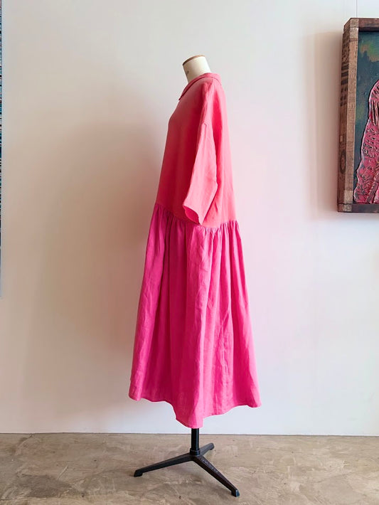 【CHECK&STRIPE(チェック&ストライプ)】小さな衿のローウエストワンピース 「やさしいリネン」