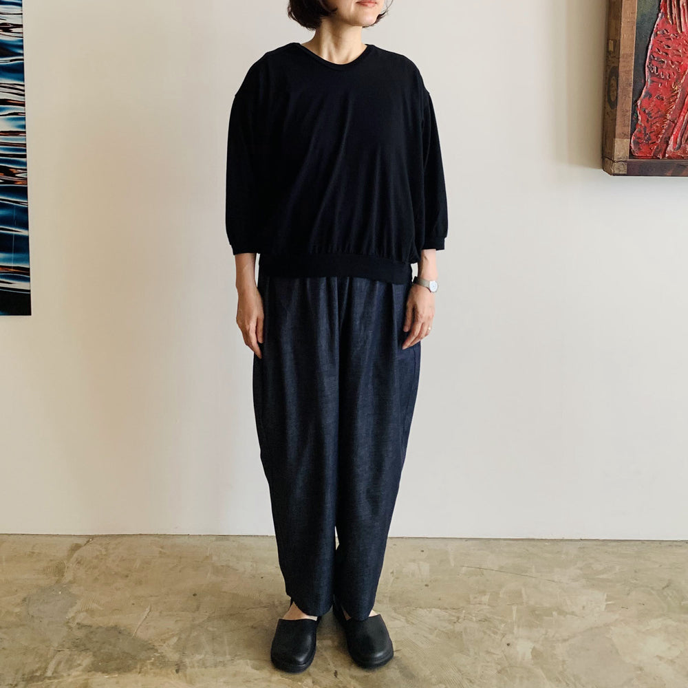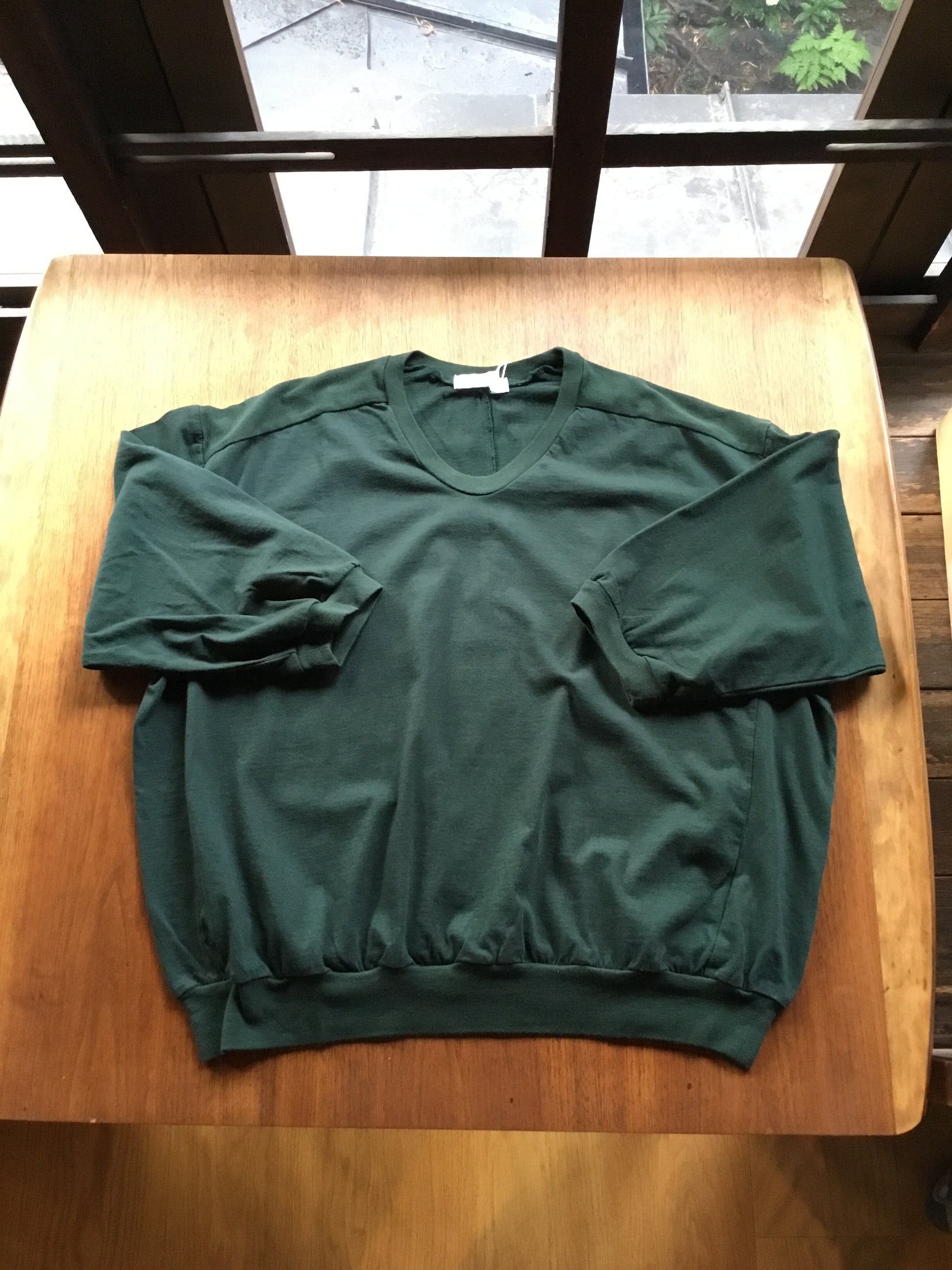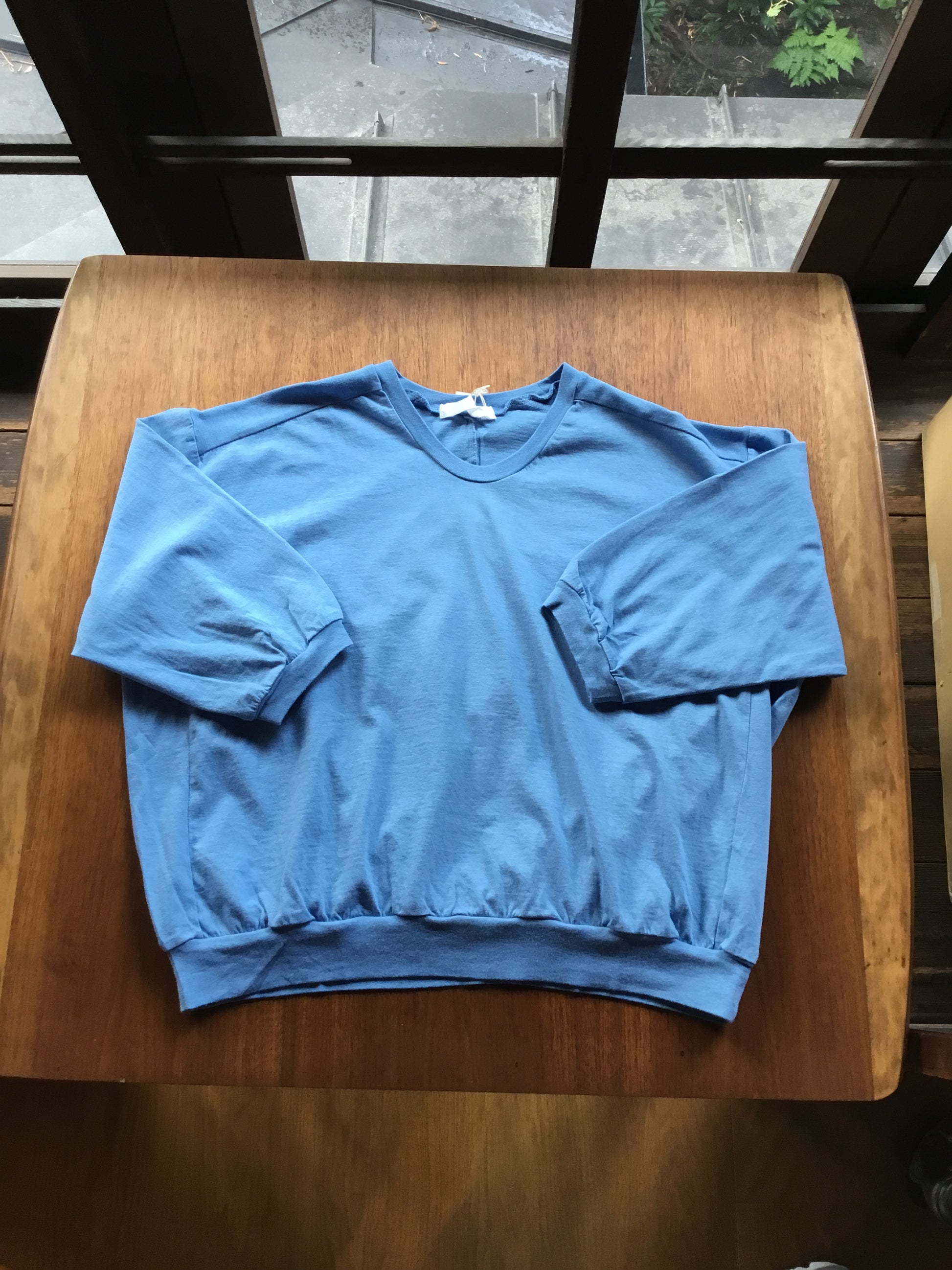 浅めのVネックで、身幅と袖はゆったりめですが、袖と裾にリブがありすっきり着ていただけます。
