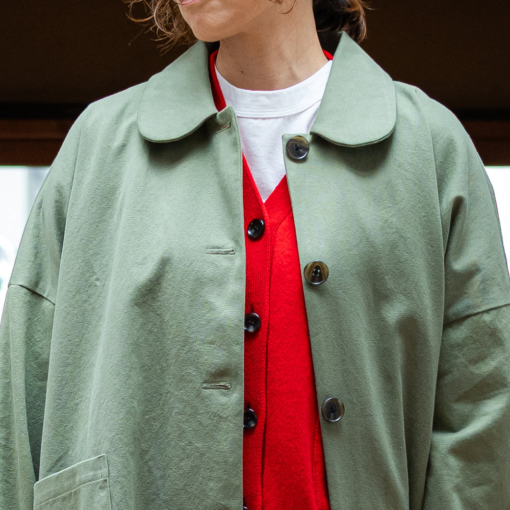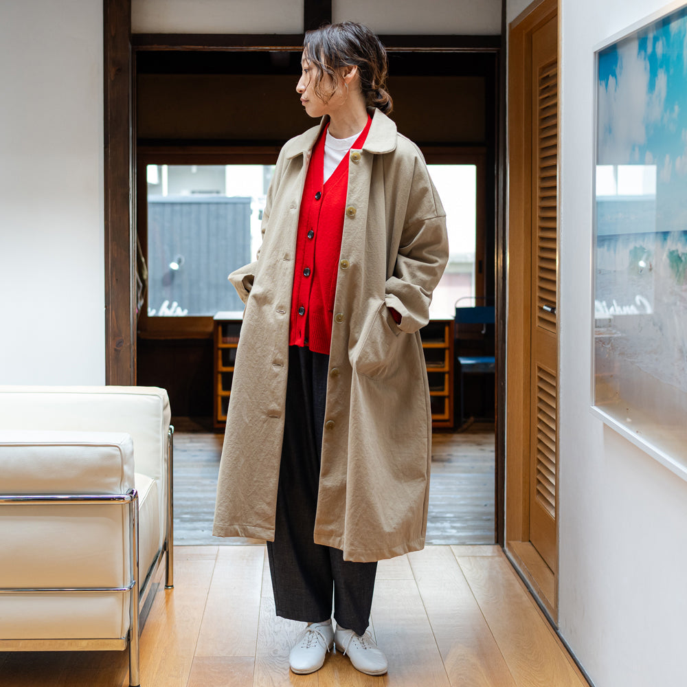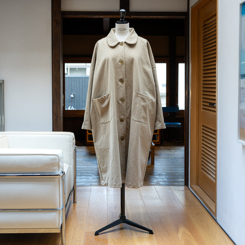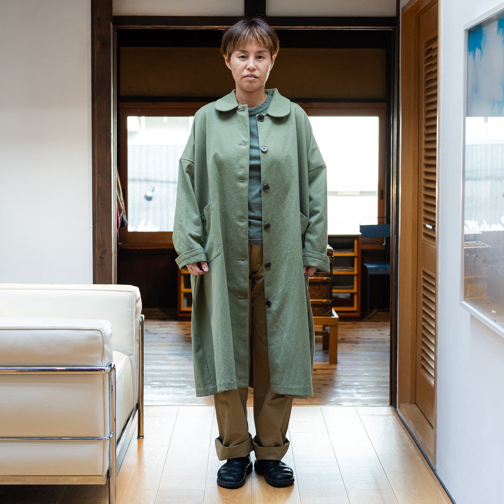 程よい柔らかさで厚みがあるチノクロスのコート。ゆったりしたシルエットで、丸襟が優しい印象に。