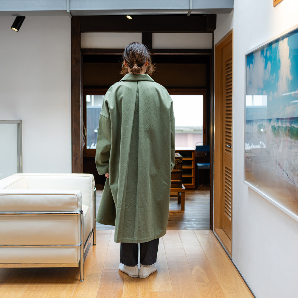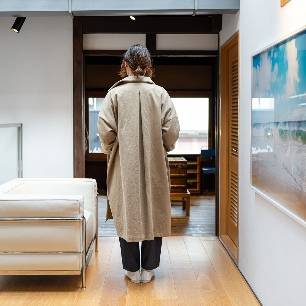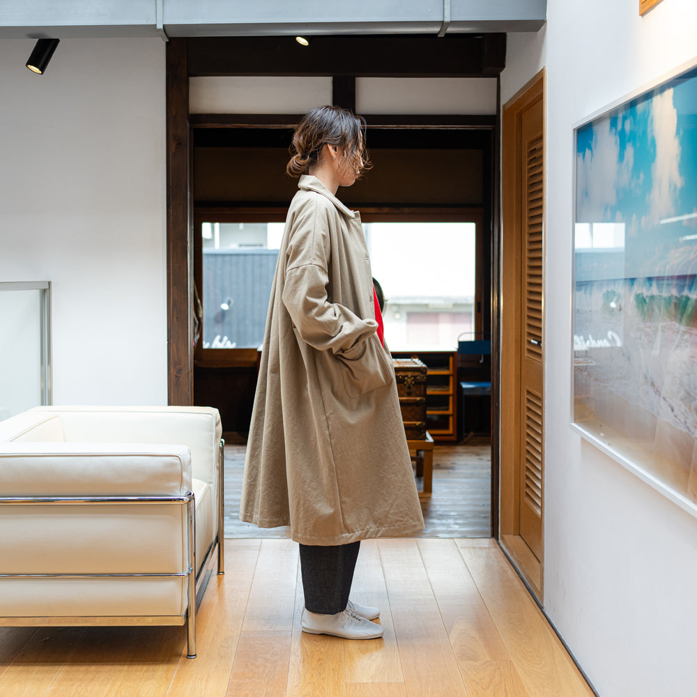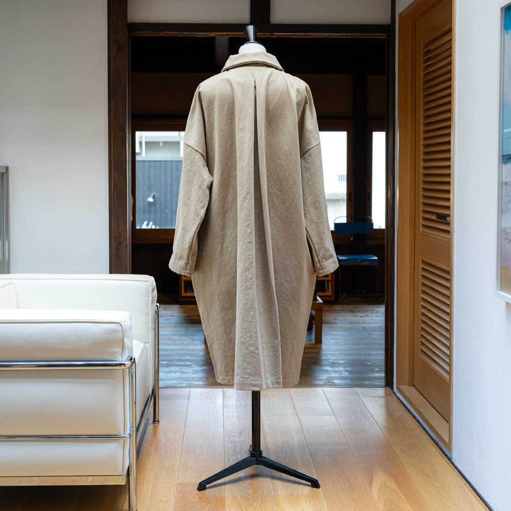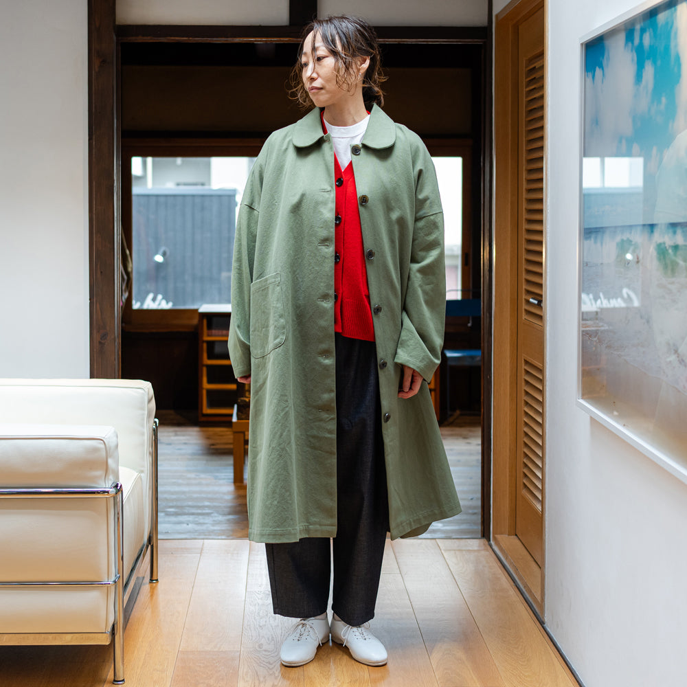 程よい柔らかさで厚みがあるチノクロスのコート。ゆったりしたシルエットで、丸襟が優しい印象に。