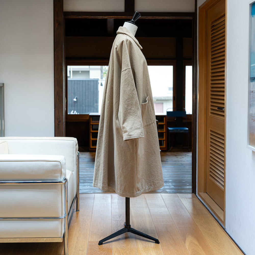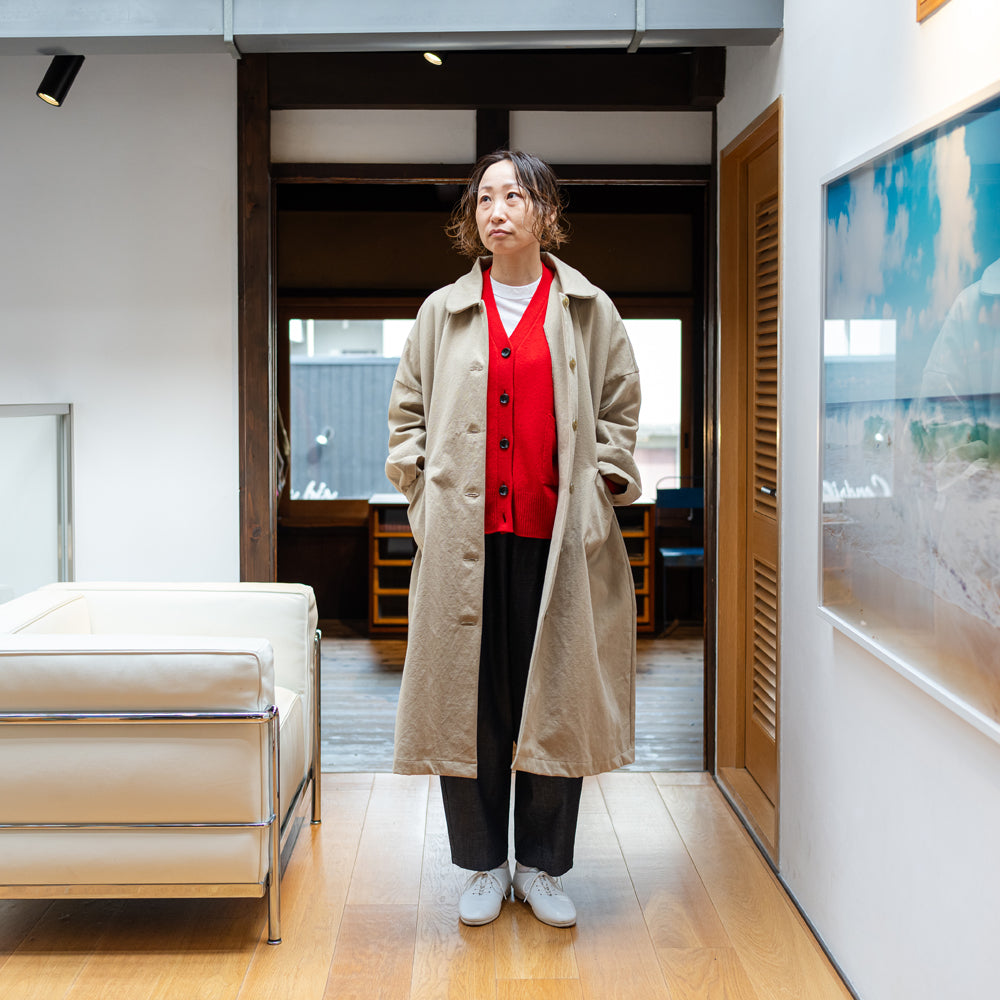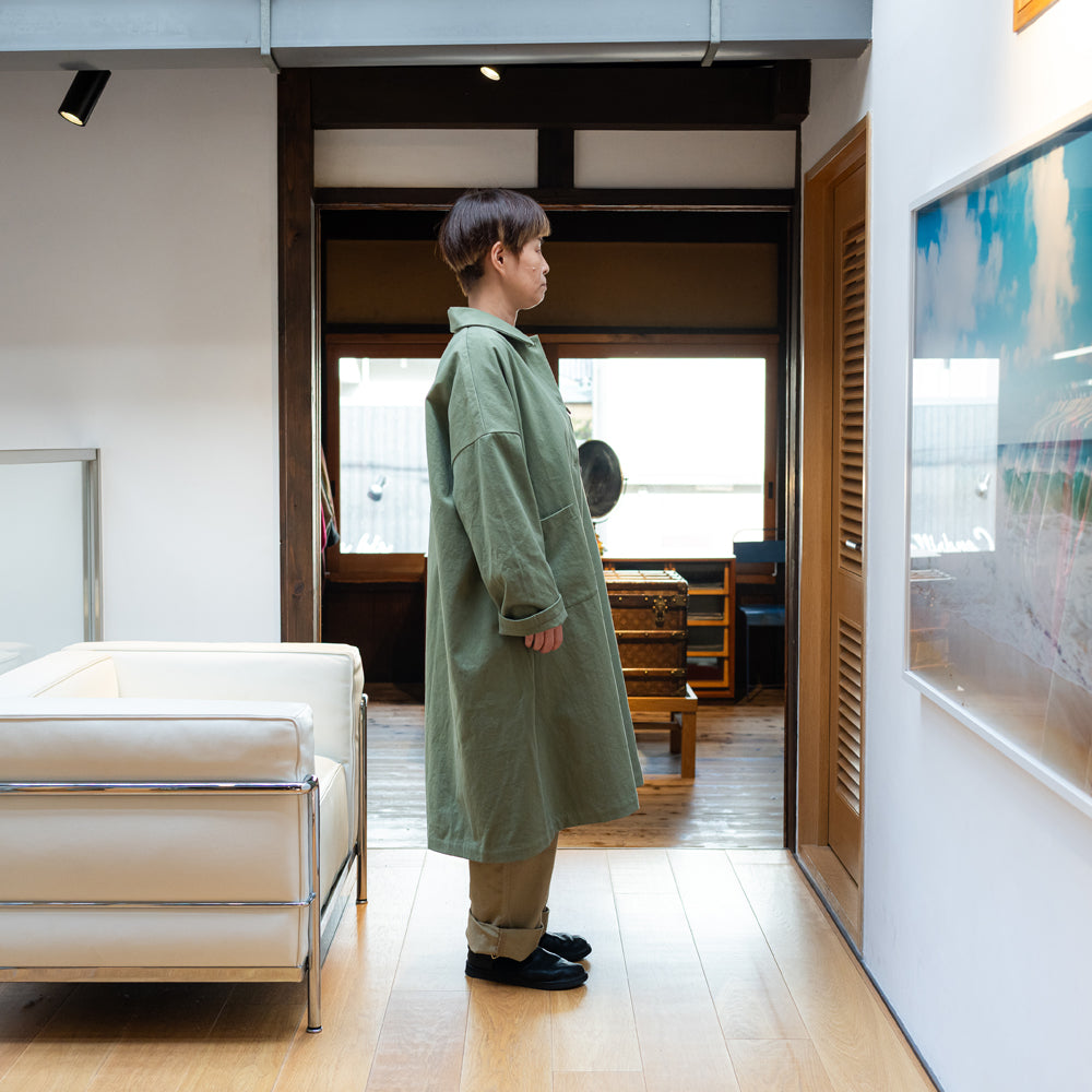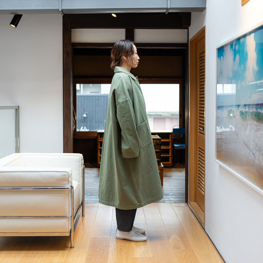 程よい柔らかさで厚みがあるチノクロスのコート。ゆったりしたシルエットで、丸襟が優しい印象に。
