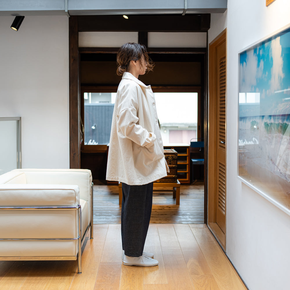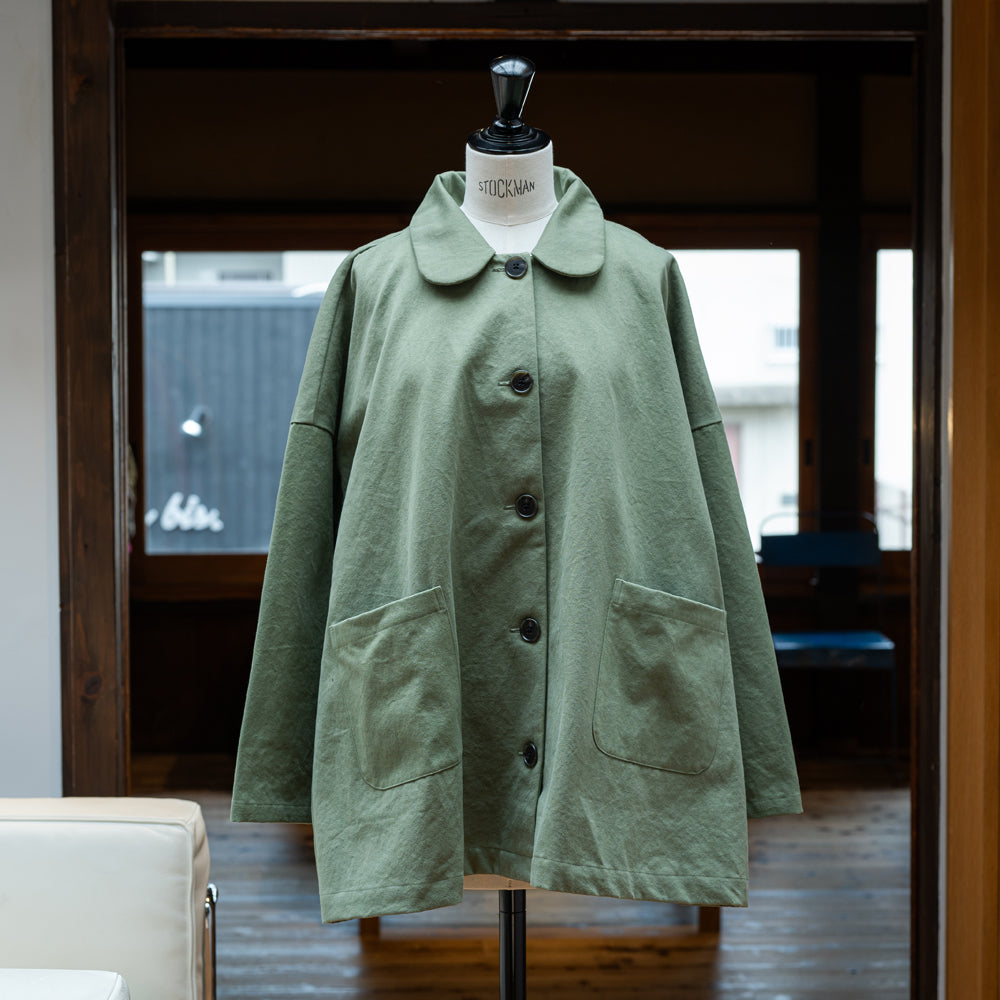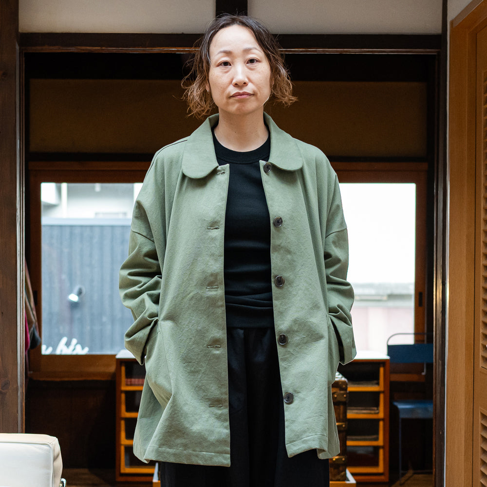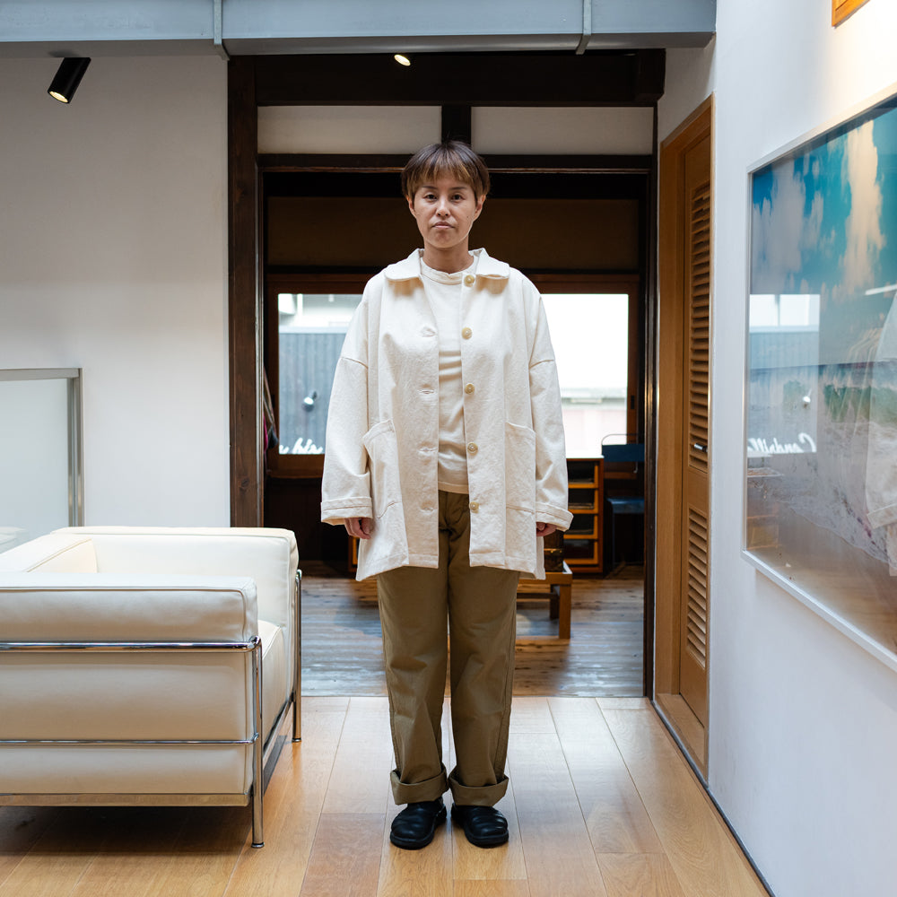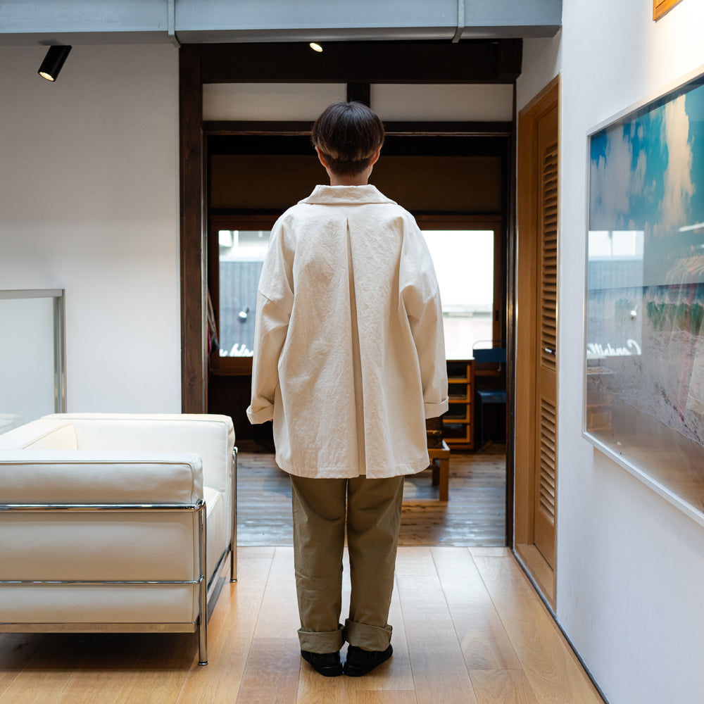 程よい柔らかさで厚みがあるチノクロスのジャケット。ゆったりしたシルエットで、丸襟が優しい印象に。