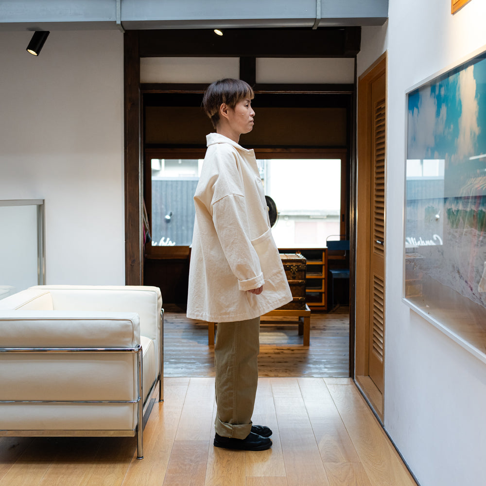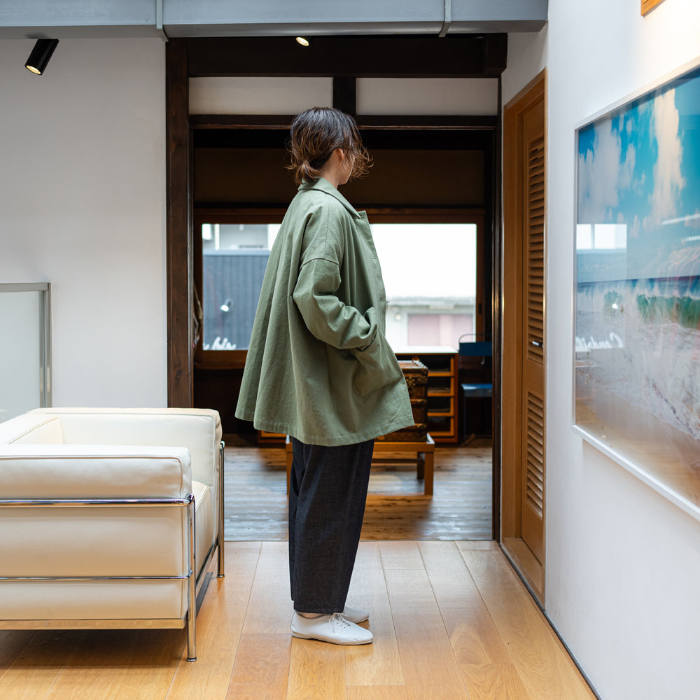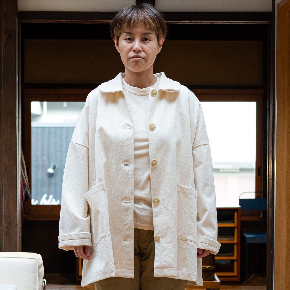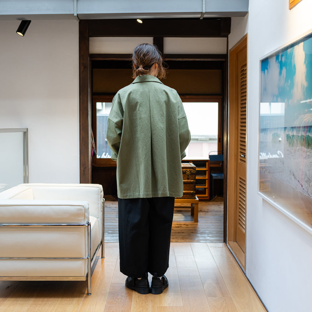 程よい柔らかさで厚みがあるチノクロスのジャケット。ゆったりしたシルエットで、丸襟が優しい印象に。