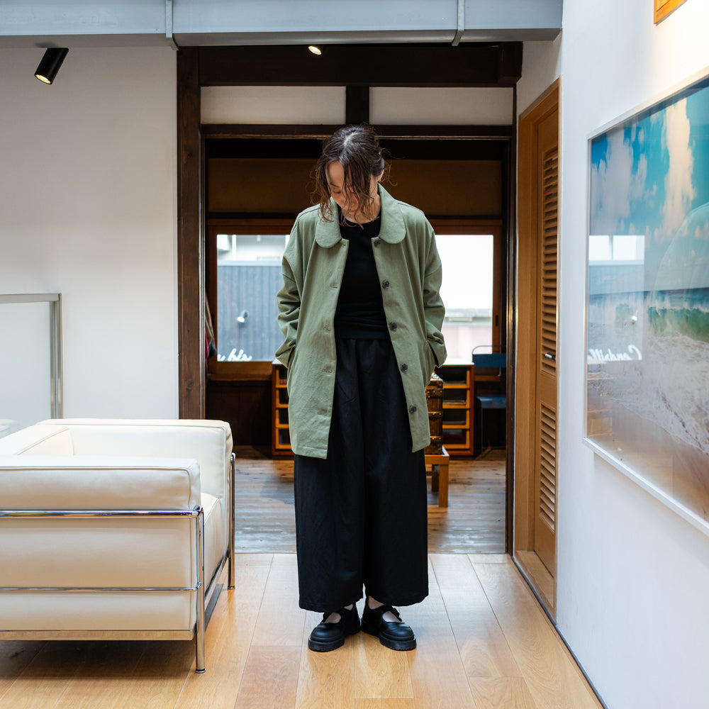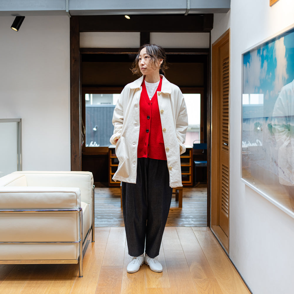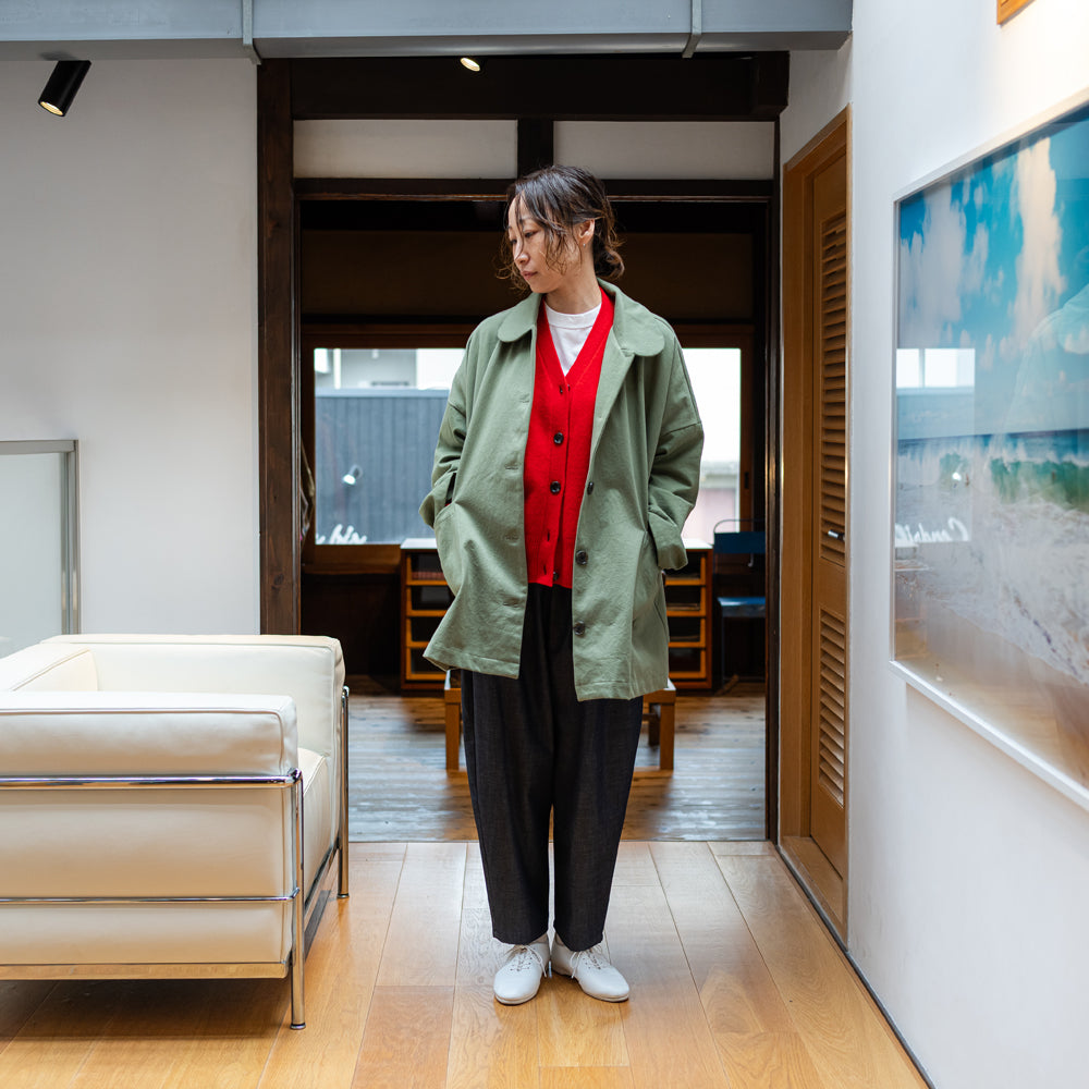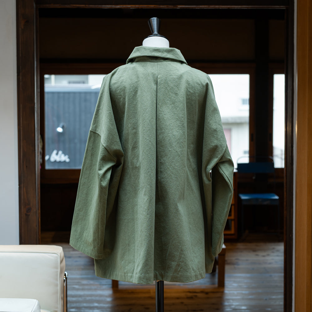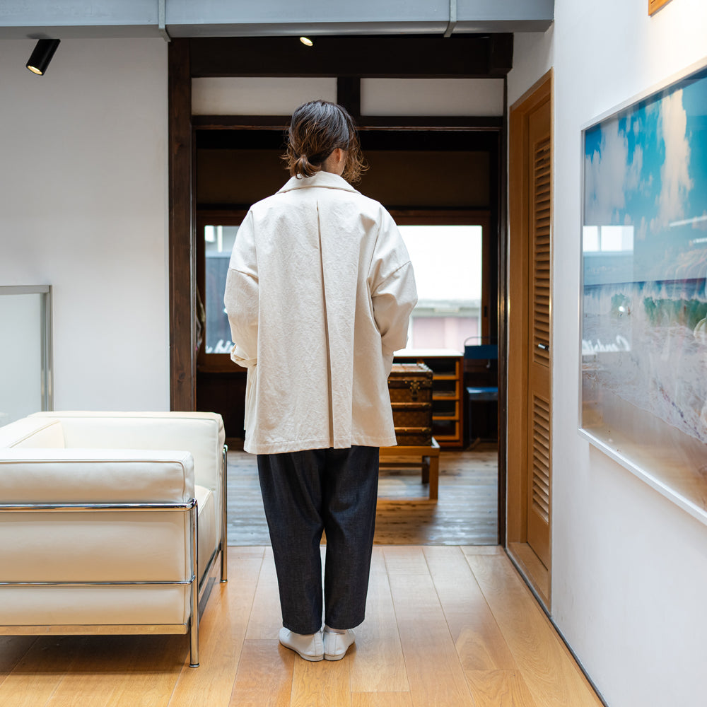 程よい柔らかさで厚みがあるチノクロスのジャケット。ゆったりしたシルエットで、丸襟が優しい印象に。