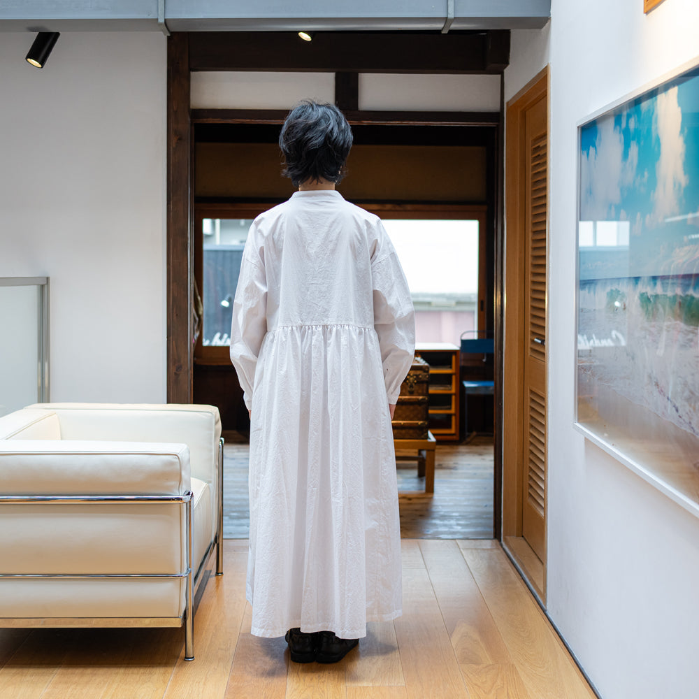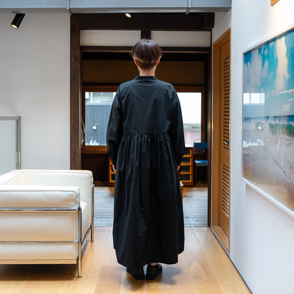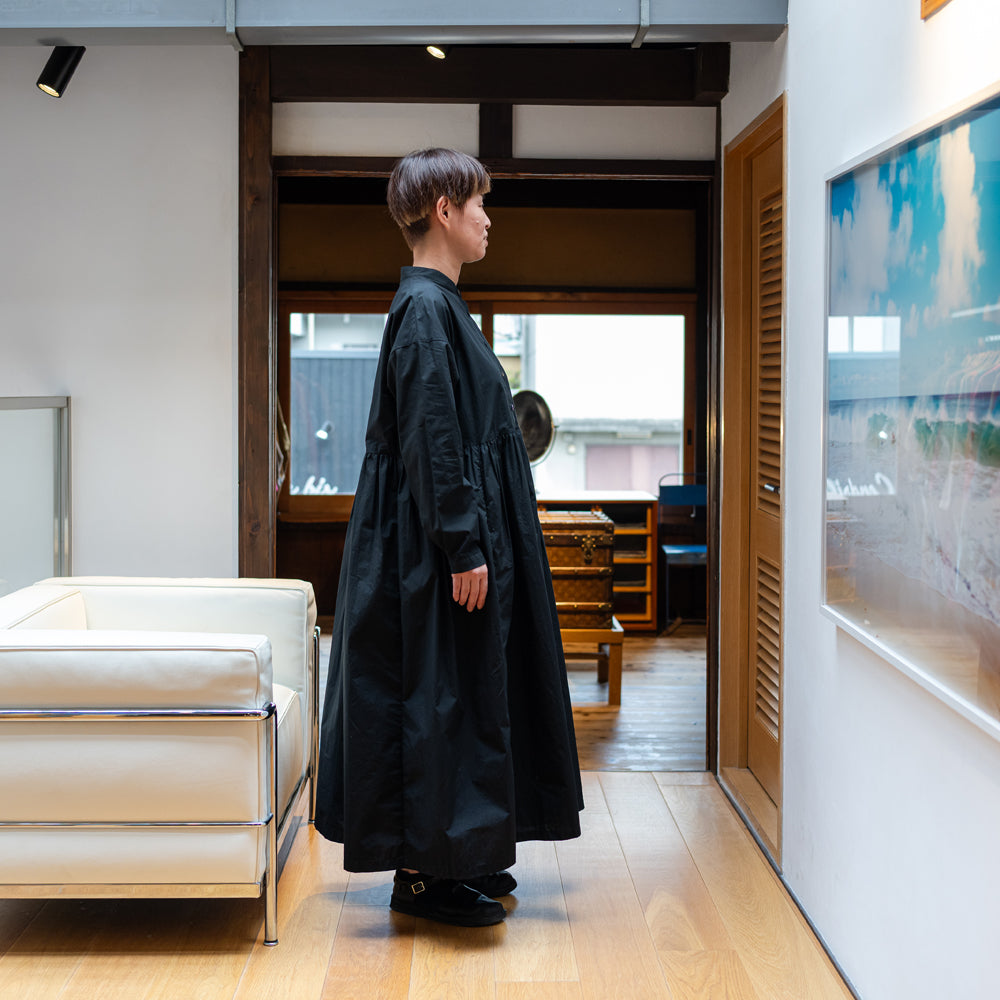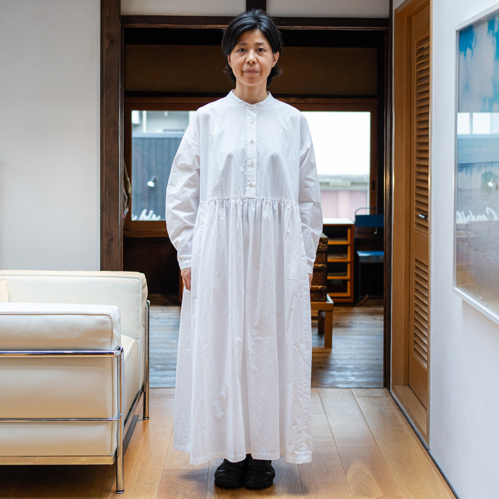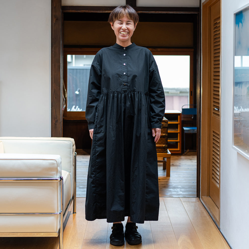 人気生地「コットンパピエ」を使用したスタンドカラーのワンピース。